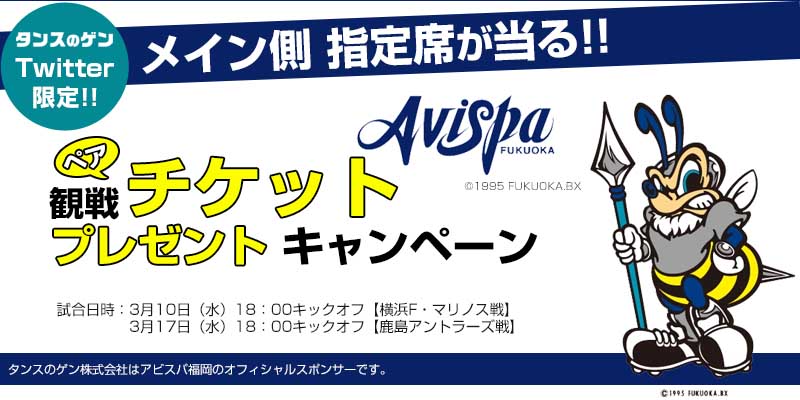タンスのゲン 公式 アビスパ観戦チケットをプレゼント 試合日程 3 10 水 横浜fマリノス戦 3 17 水 鹿島アントラーズ戦 応募方法 Tansu No Genをフォロー この投稿をrt 希望の試合をコメント 応募締め切り 2月28日 日